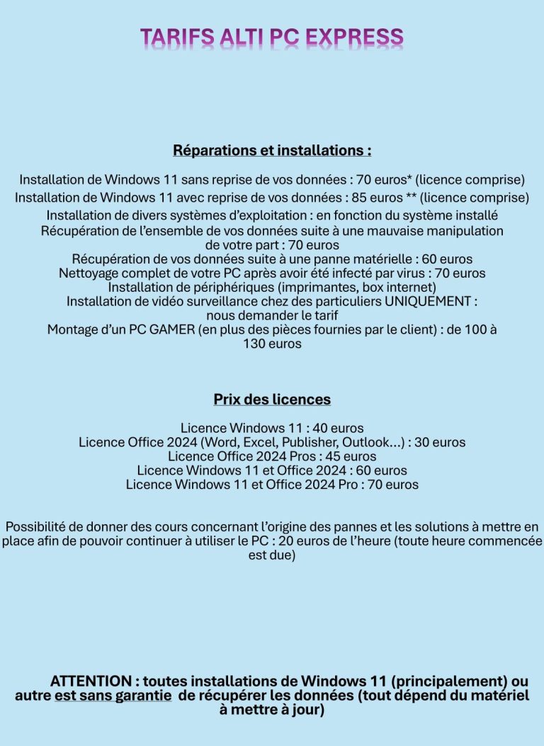 ALTI PC EXPRESS vous présente ses tarifs compétitifs pour diverses interventions informatiques. Que ce soit pour des réparations, des installations ou des conseils, nous avons des options adaptées à vos besoins. Nous nous engageons à vous fournir des services de qualité à des prix accessibles, afin que chacun puisse bénéficier d'une assistance technique de confiance.